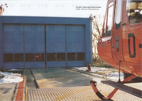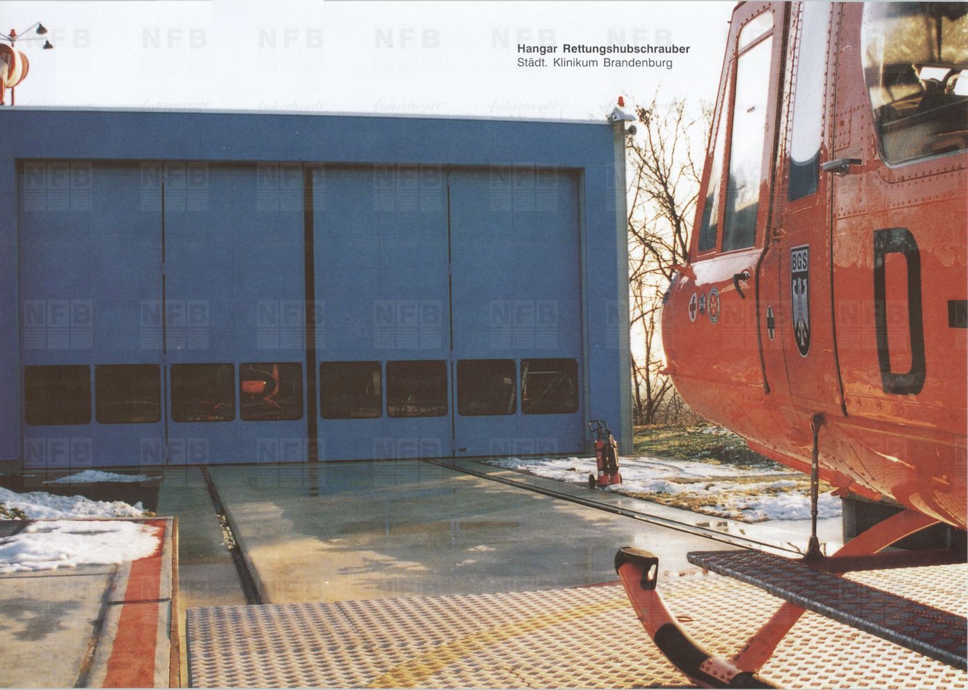 1 freitagendes, 4-teiliges Falttor 11,5 x 6 m für einen Rettungshubschrauber-Hangar.